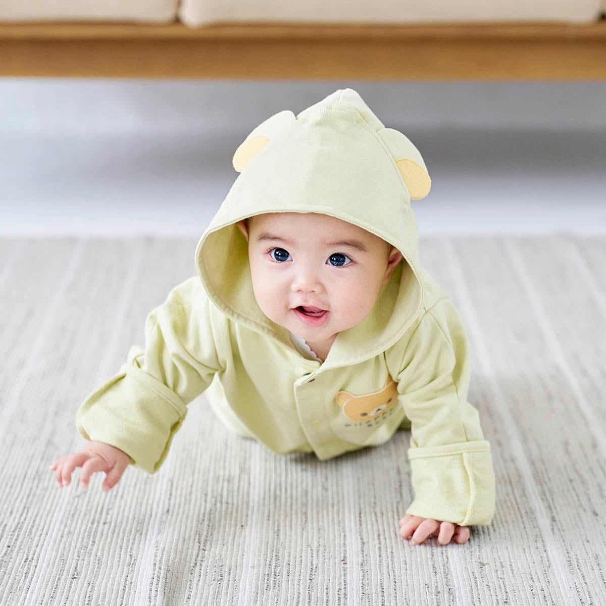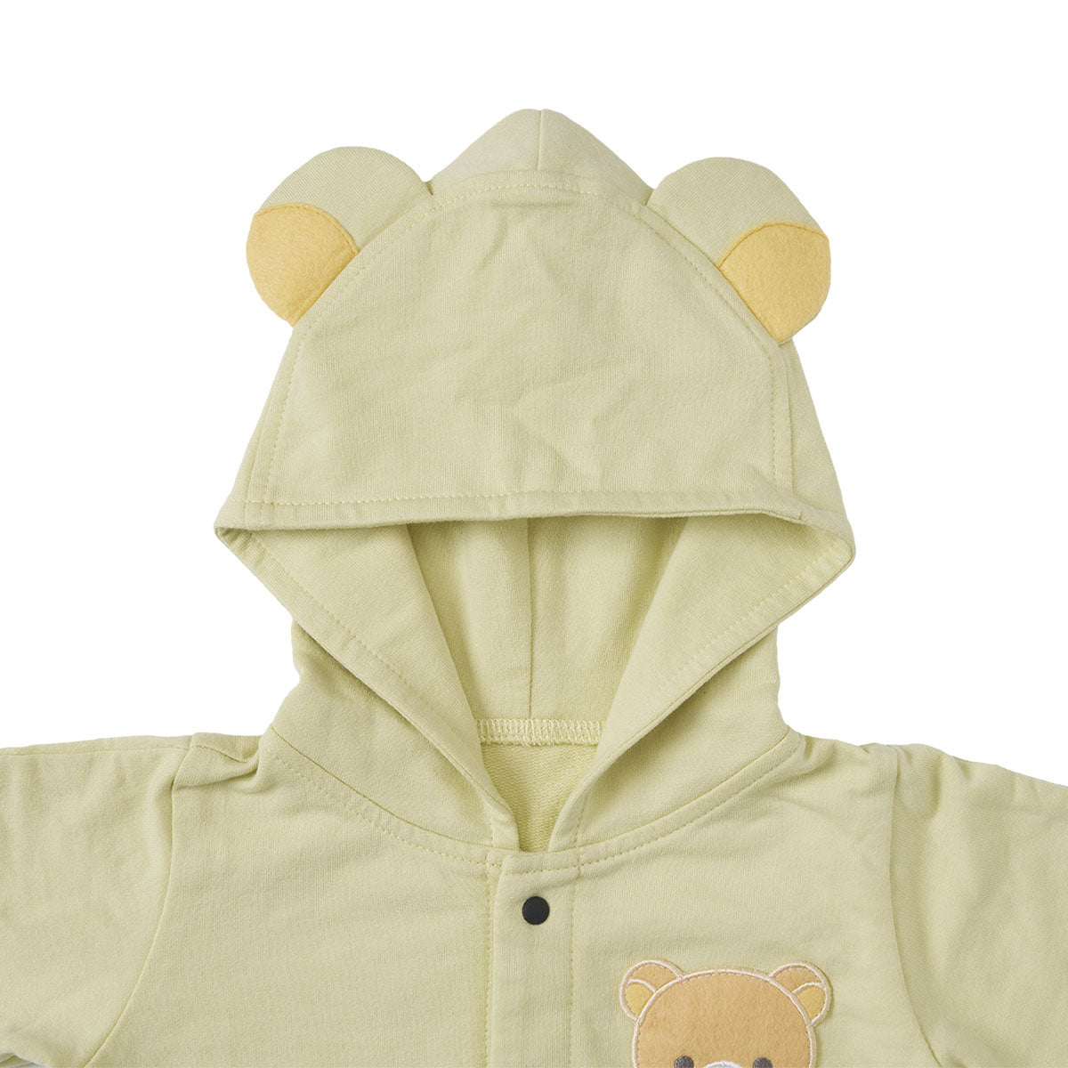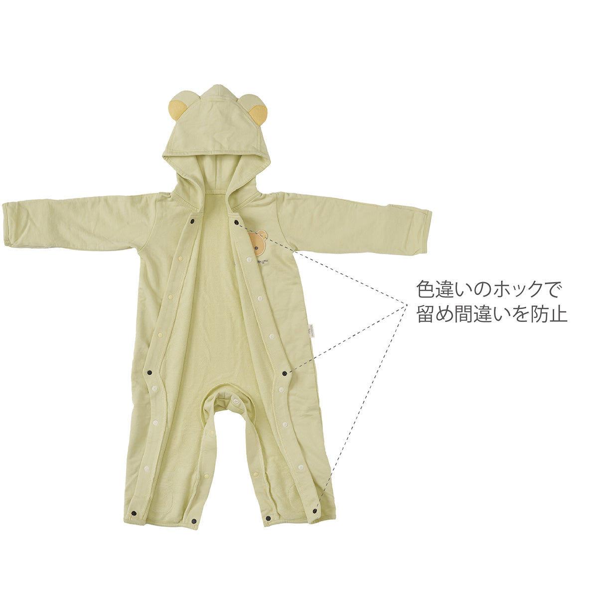 - 前面と腿部分がホックで開くので着替えやすく、おむつ替えもらくらく。